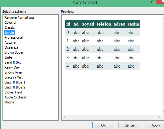 Task bölümünden Auto Format seçeneğinden tablomuza hazır stillerden birini uygulayalım.